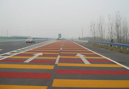 鋪筑不同色彩的路面在某種程度上比垂直的交通標志更好,它可以直觀的給駕駛員以信號。例如,在交通事故多發地段,可以鋪筑紅色或黃色路面,直觀地提醒駕駛員謹慎行車。在通過中小學校區的道路上, 鋪筑鐵紅色路面, 使車輛減速慢行, 避免危險的發生。在高速公路彎道、下坡道、隧道入口及出口段, 按一定寬度分組橫向設置彩色防滑減速帶, 用以防滑減速, 采用不同色彩路面, 使之清新醒目, 增強行車的安全性。實踐證明, 彩色路面豐富的色彩能刺激駕駛員大腦, 緩解駕車疲勞程度、保持良好情緒、降低事故隱患。瑞典在阿爾卑斯山上的某些特別危險的路段涂上了紅顏色, 結果交通事故減少了85%-90%。我國也曾做過相關的試驗, 為了降低因車速過快而造成的事故, 曾在長距離的路段上涂上幾十條相間的白色線條, 駕駛員通過這些白色相間的線條, 看起來猶如水中的波紋一般, 感覺速度過快, 從而使駕駛員自覺地降低車速。